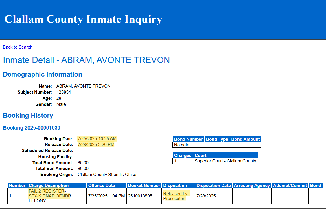 Last week, Abram — a convicted sex offender— was booked again into Clallam County Jail.