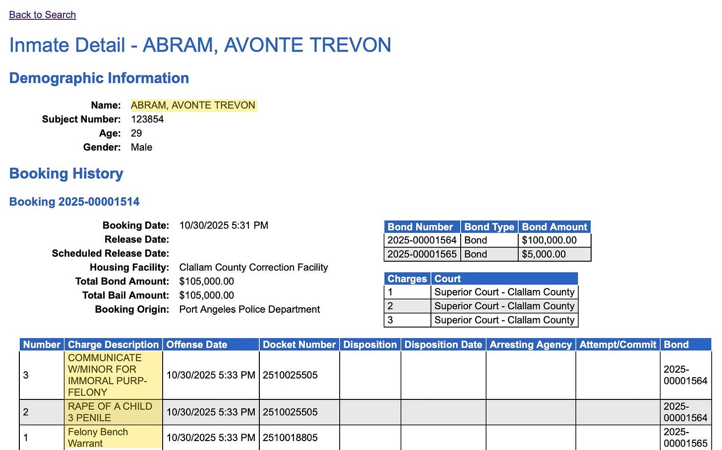 And now, just two days ago, Abram was booked into Clallam County Jail again — this time for a felony bench warrant, Communicating with a Minor for Immoral Purposes, and Rape of a Child in the Third Degree.