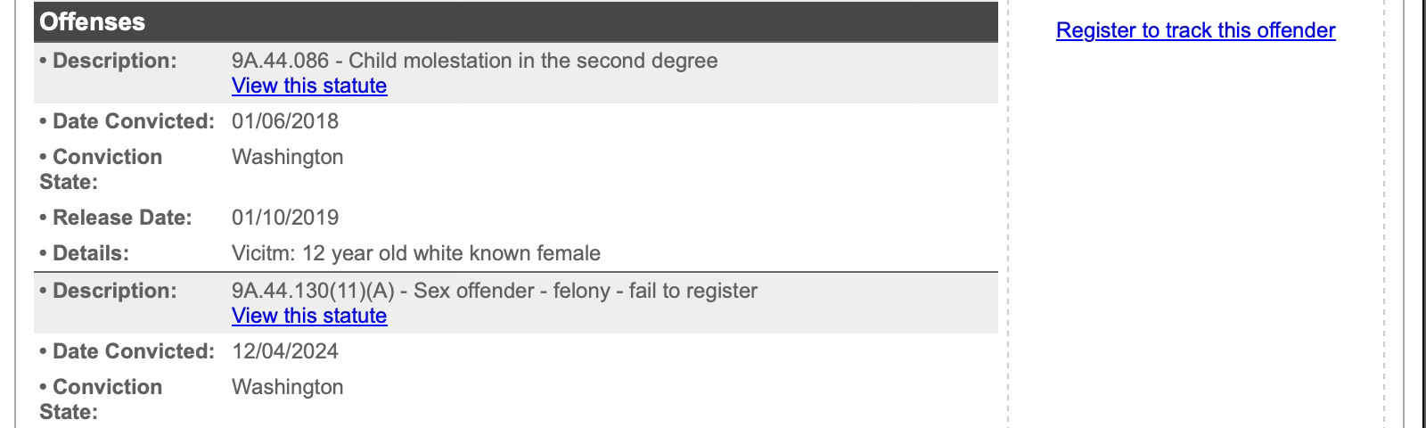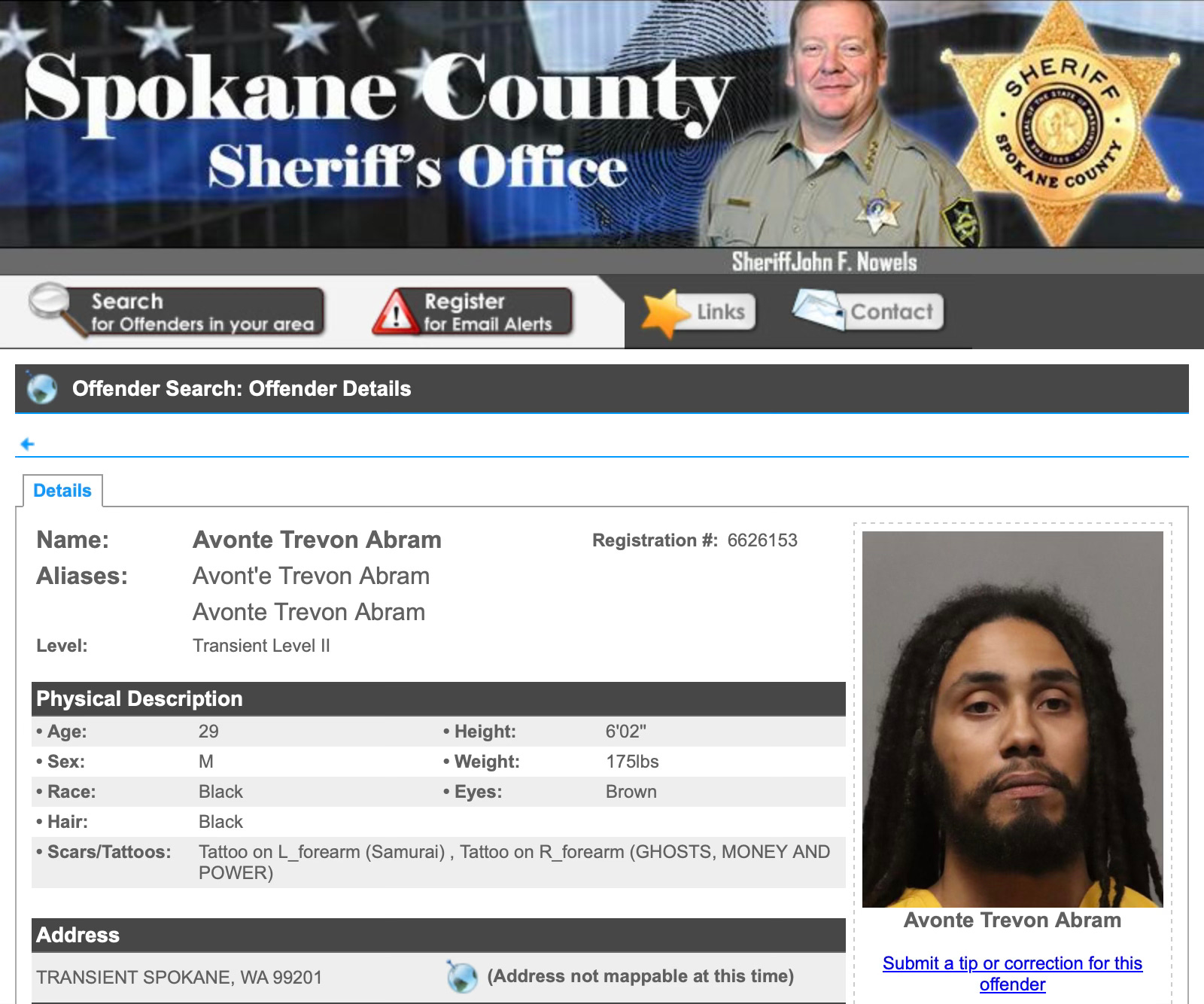 This is a man who molested a 12-year-old girl in 2018. That conviction alone should give any community pause. But Abram isn’t even from here. He’s registered out of Spokane’s 99201 zip code — more than 300 miles away.
