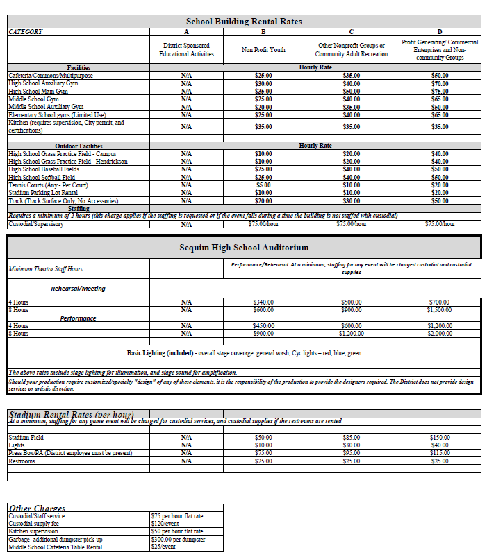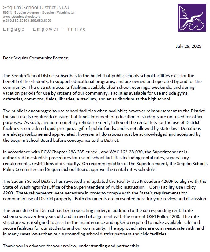 In a letter dated July 29, 2025, the Sequim School District explained that these changes were prompted by a need to align with the state’s updated policy (OSPI Policy 4260) on facility use. The previous rate schedule was more than a decade old, and district officials say the new fees help fund necessary upkeep and ensure student-focused resources are not diverted.
