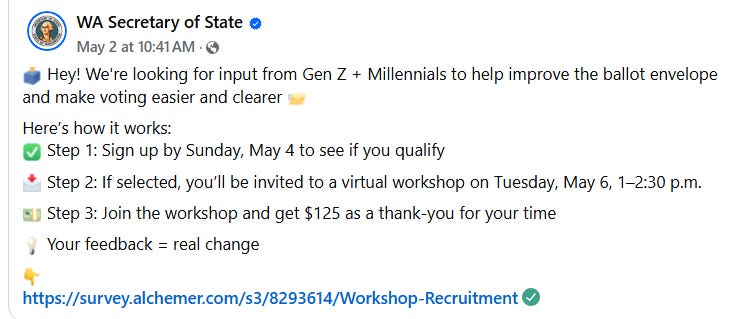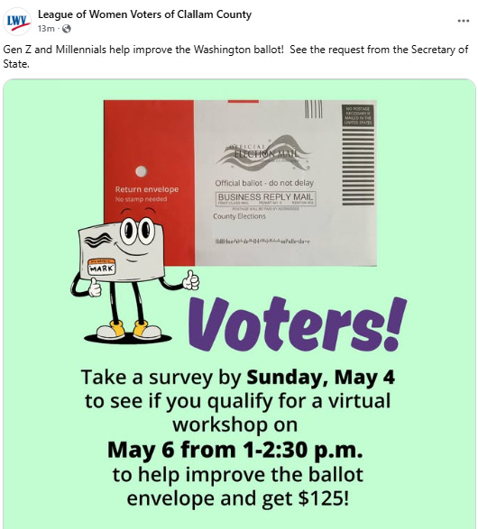 The League of Women Voters of Clallam County (LWVCLA) recently announced a virtual workshop aimed at improving Washington’s ballot envelope, offering $125 to selected Gen Z and Millennial participants. While the intent to engage younger voters is commendable, the structure of this initiative raises important questions about whether it aligns with the League’s own principles of equity and inclusion.