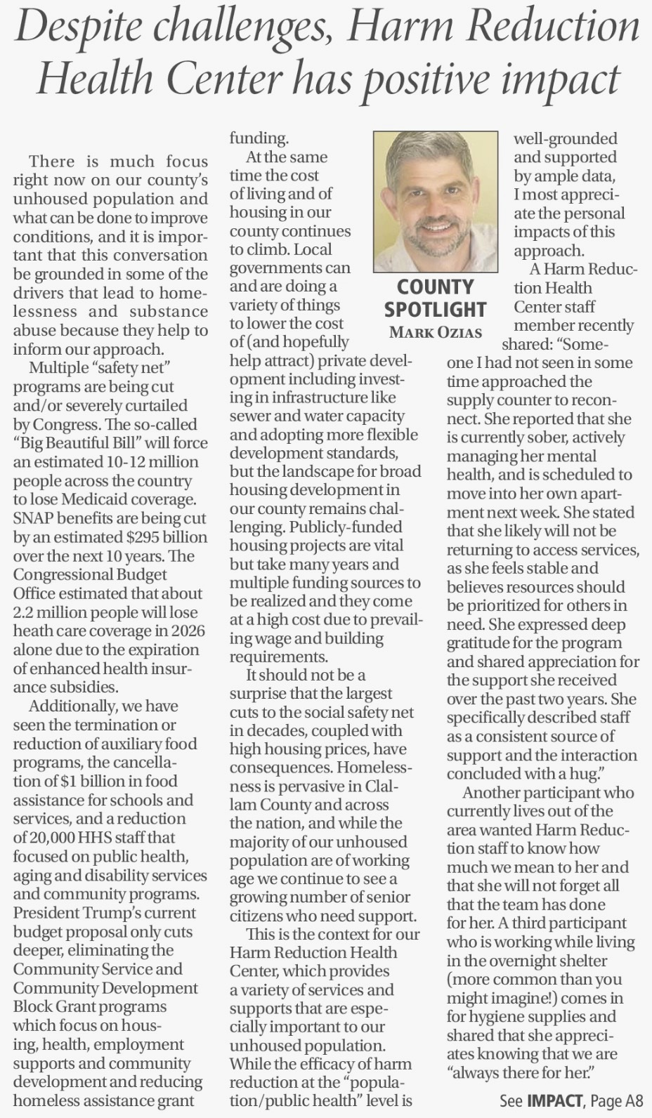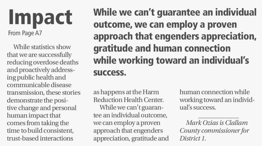 His column isn’t just a defense of harm reduction. It’s a framework for how the public is supposed to understand what’s happening in Clallam County.