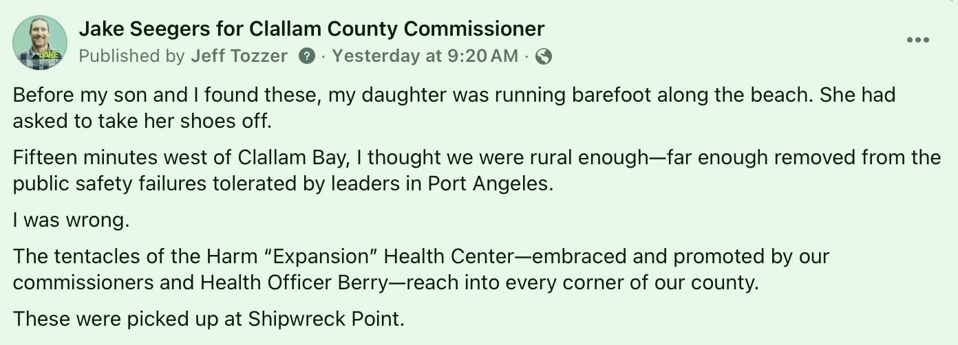 A single image—one child, one beach, one bottle filled with used needles—cuts through the policy debates and forces a simple question: after years of harm reduction policy in Clallam County, where are the measurable results? As officials point to compassion and isolated success stories, residents are left confronting a very different reality—one that can’t be explained away with anecdotes.