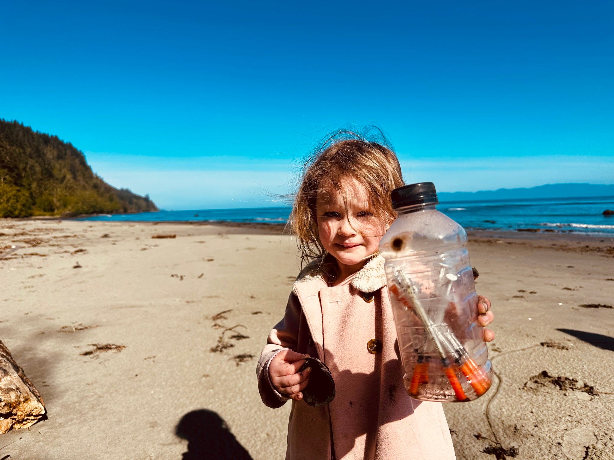 A four-year-old girl stands on a beach in Clallam County, holding a Gatorade bottle—inside it, used hypodermic needles.