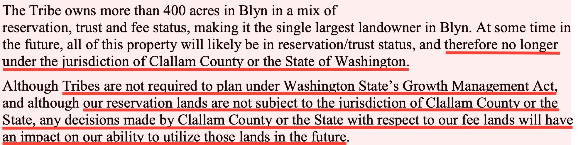 That single sentence carries significant implications. Trust land is not subject to local or state jurisdiction—meaning zoning, taxation, and regulatory authority shift away from Clallam County and the State of Washington.