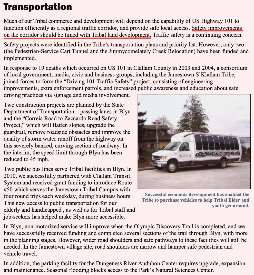 At a minimum, this suggests alignment between transportation planning and Tribal economic expansion. Whether that includes specific projects like Highway 101 roundabouts is not explicitly stated—but the framework for coordination is clearly there.