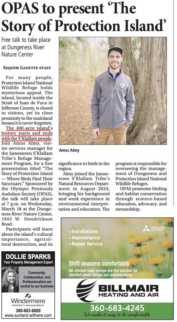 According to the Sequim Gazette, Protection Island’s history “starts and ends with the S’Klallam people.” That claim, however, overlooks documented history indicating the presence of the Chemakum Tribe prior to the S’Klallam.