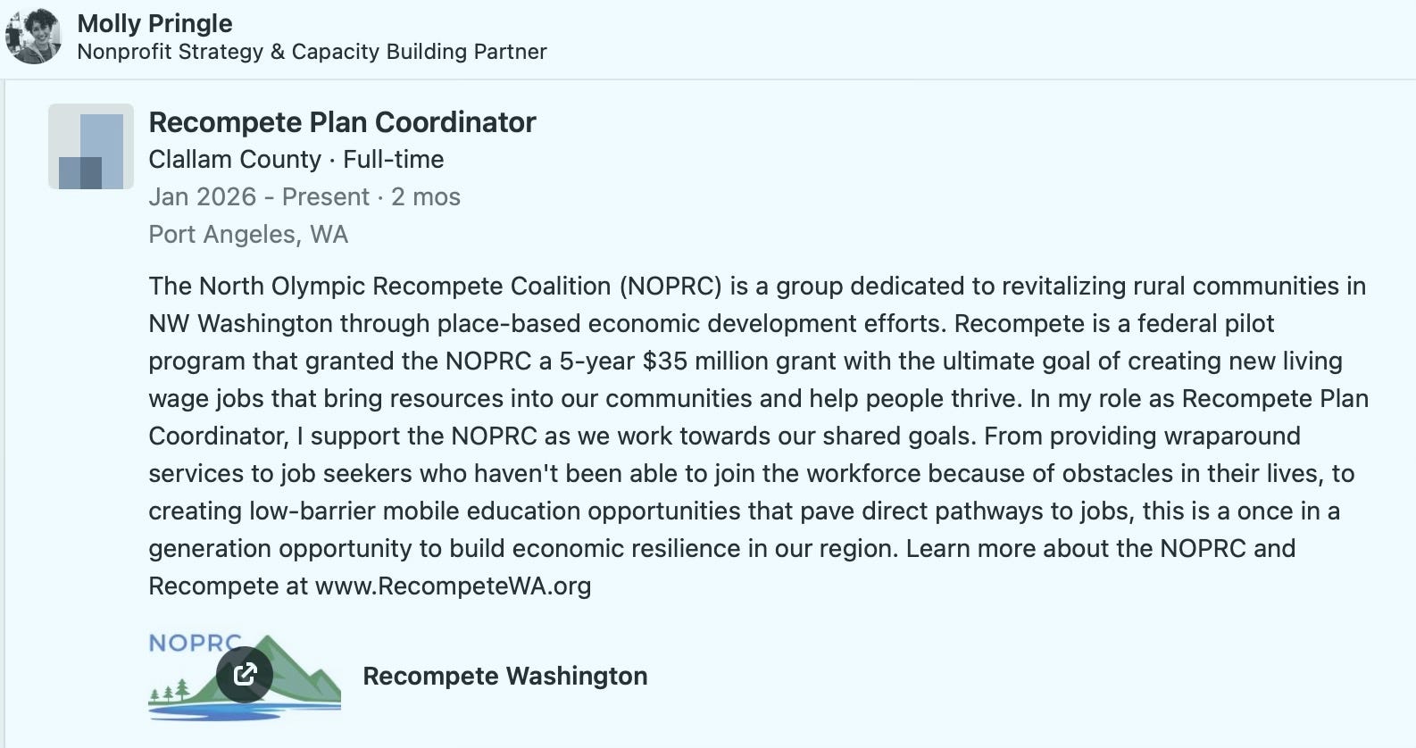 The County’s Recompete Plan Coordinator position, which works for the Board of Commissioners, went to Molly Pringle.