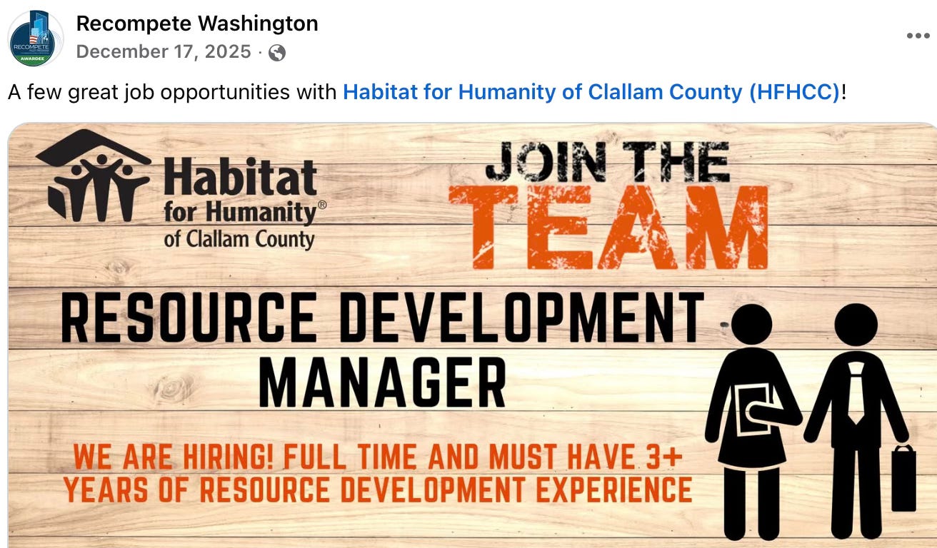 Habitat for Humanity of Clallam County became the only affiliate in the nation to hire a Native American Housing Liaison, funded by public grant dollars and following a $50,000 donation from the Jamestown S’Klallam Tribe.