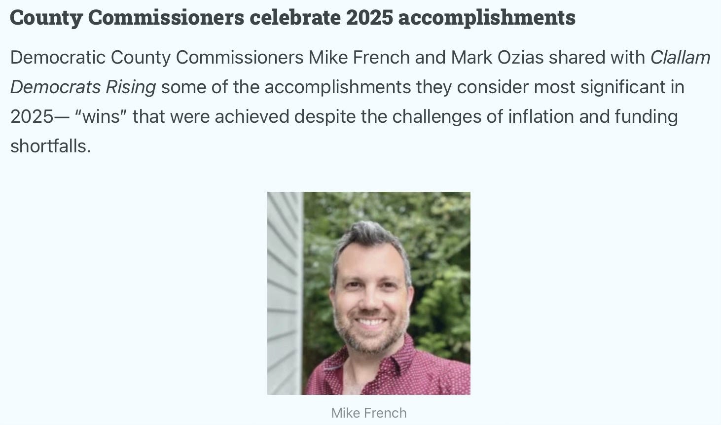 In the latest issue of Clallam Democrats Rising, Commissioner Mike French highlights what he calls a banner year of accomplishments. But behind the celebratory tone are delayed projects, rebids, modest workforce outcomes, and housing models that raise serious questions about cost and priorities. If 2025 was a year of “progress,” the public deserves a clearer accounting of what that progress has actually delivered.