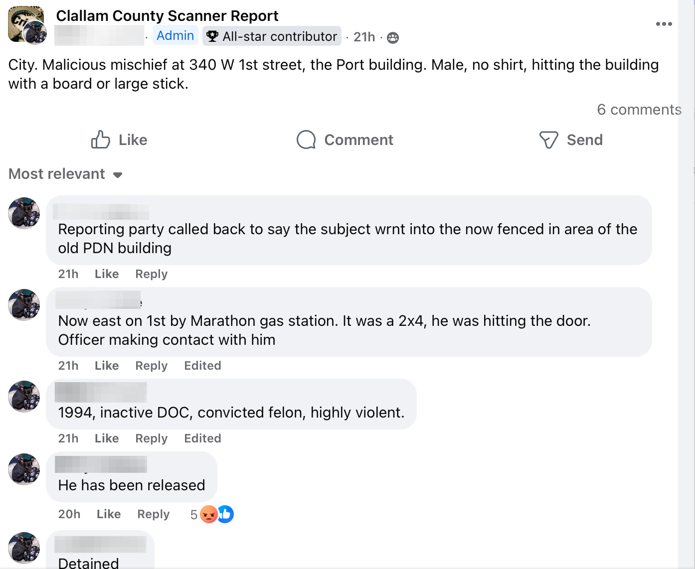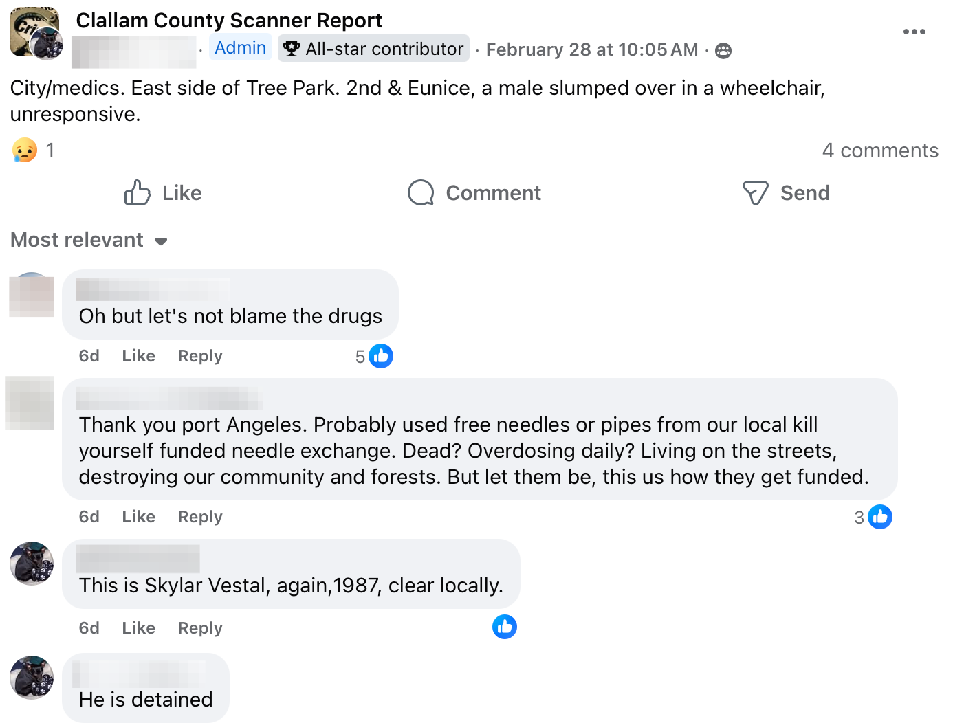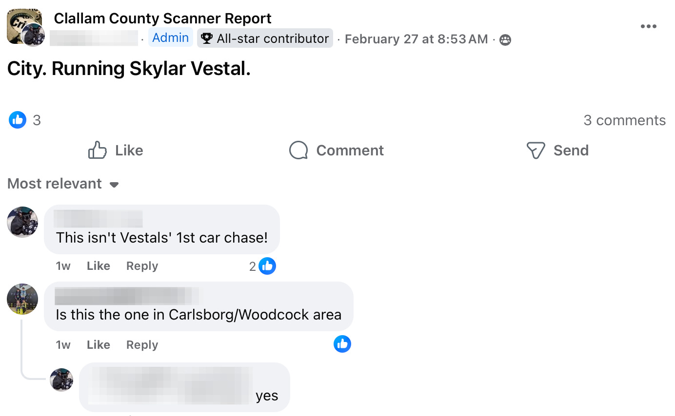 Each week, residents following local police scanner pages and neighborhood groups piece together a picture of daily life that rarely makes the headlines. This week’s Social Media Saturday reads like a familiar script: overdoses and unresponsive people, out-of-county warrants, psychotic episodes unfolding in public spaces, shoplifting calls, prowlers reported in neighborhoods, a fire in a public park, assaults at a bus stop, and even a car chase. For many residents, these reports are no longer surprising — they’re simply the background noise of life in Clallam County.