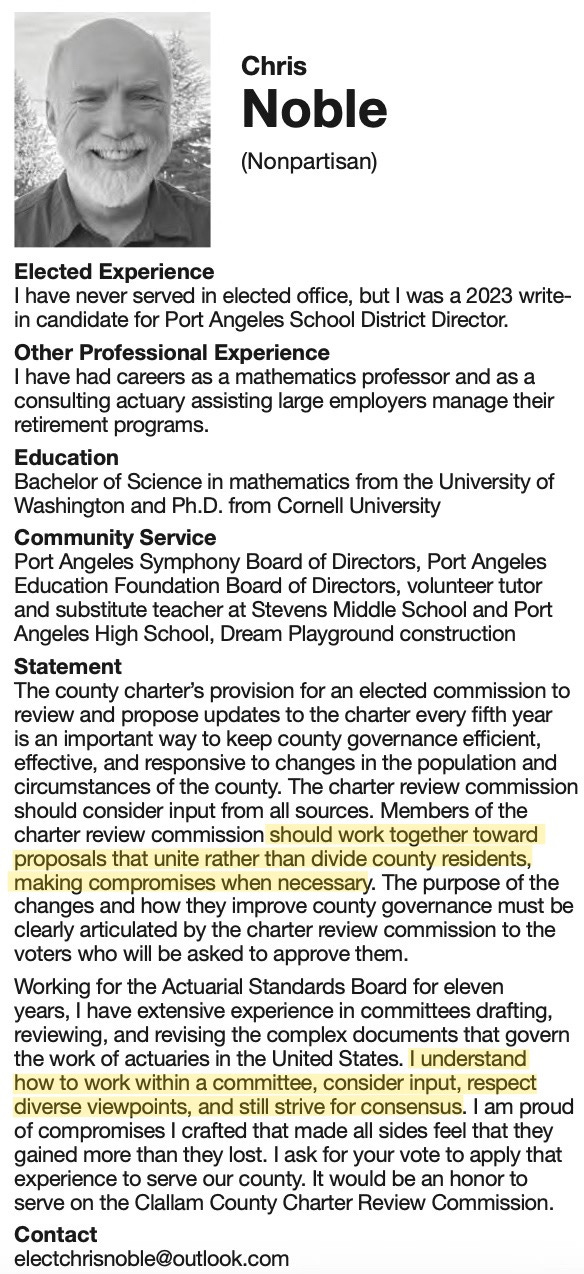 Chair Fisch ran as the Secretary of the League of Women Voters of Clallam County, an organization known for nonpartisanship and advocacy for open government. The League’s leadership frequently sits in the gallery and observes Fisch overseeing Charter Review Commission meetings.