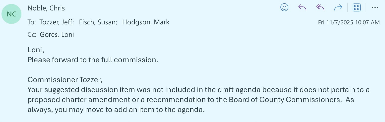 Your suggested discussion item was not included in the draft agenda because it does not pertain to a proposed charter amendment or a recommendation to the Board of County Commissioners. As always, you may move to add an item to the agenda. [From Chris Noble]
