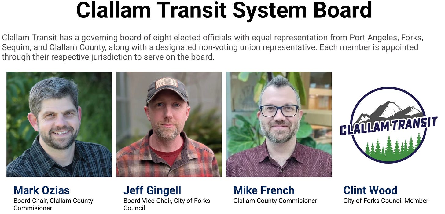 Public involvement is essential to improving safety on local transit. The Clallam Transit System Board meets at 12 p.m. on the third Wednesday of each month, with hybrid in-person and Zoom options. Meeting materials, schedules, and board contact information are available by clicking here. The Clerk of the Transit Board can by contacted by emailing frontdesk@clallamtransit.com.