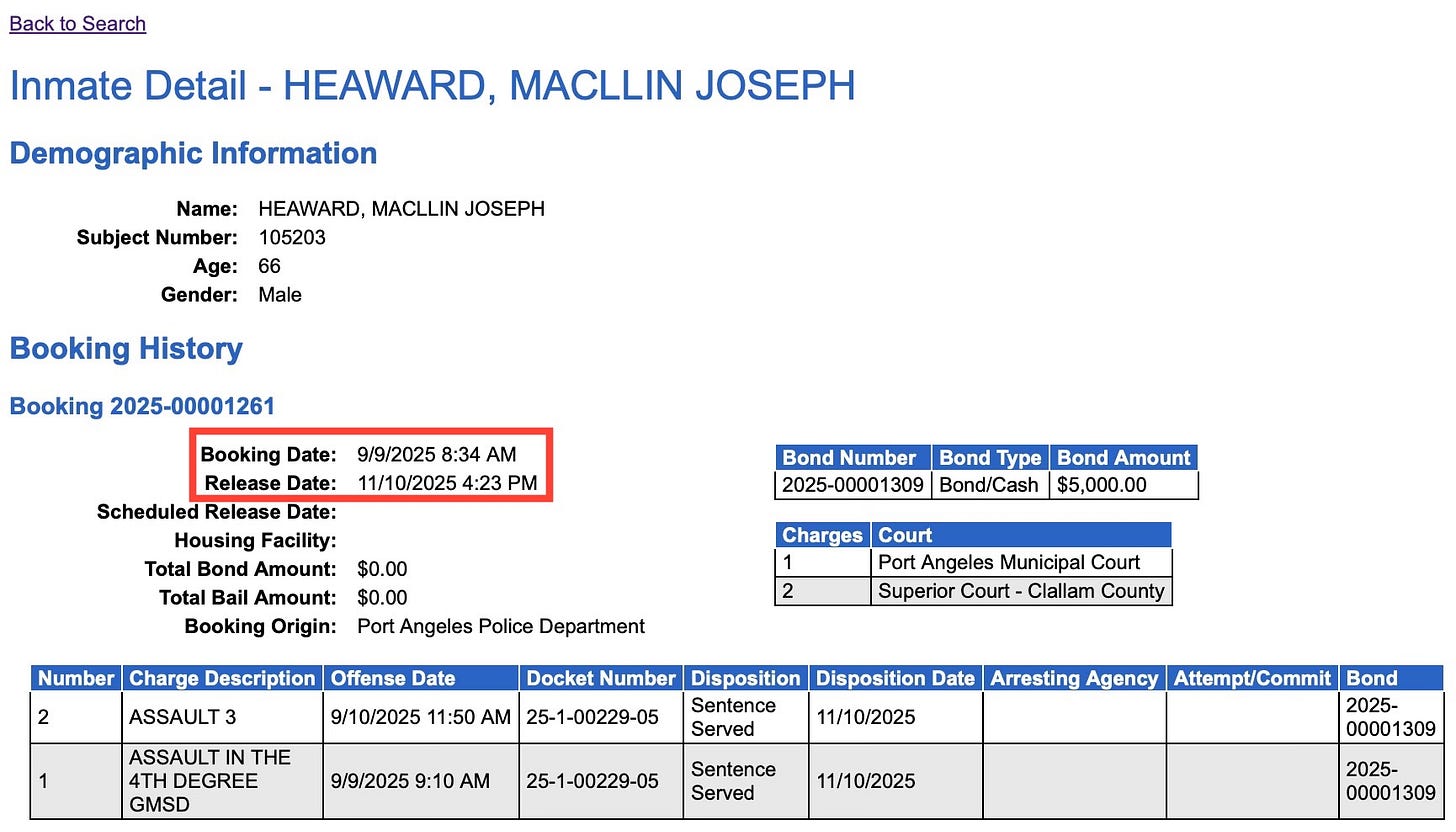 Heaward was released from Clallam County Jail two months later, on November 10th.