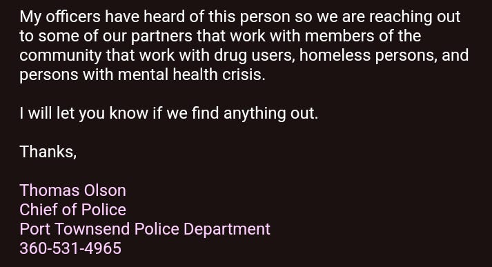 Bella and her mother have repeatedly tried to contact law enforcement. “I’ve emailed every single—I’ve emailed the Chief, the head of Port Angeles, every single email that I could find for the Port Angeles Police Department, and I’ve never got an email back and it’s been since May 22nd,” said Bella. Port Townsend police have at least acknowledged her messages and are reportedly aware of Fisher’s drug use.
