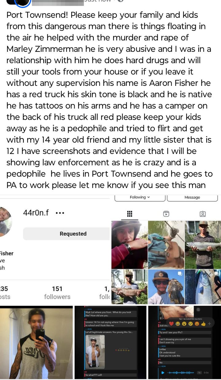 Bella said she has heard rumors connecting Fisher to the disappearance of 27-year-old Marley Zimmerman, who has been missing since January 20. Marley’s family says she left her Port Angeles home at 2:00 a.m., wearing all black and carrying a green or tan backpack. Her phone has been off since, and her family is offering a $2,000 reward for information.