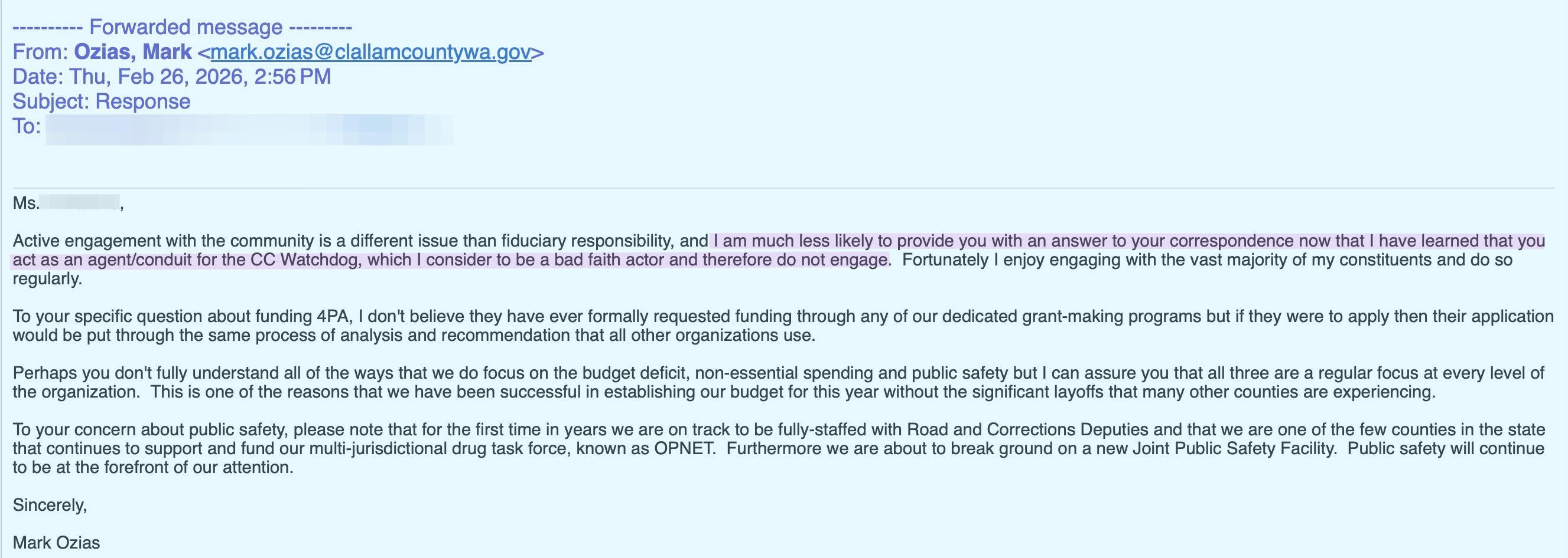 A Clallam County resident wrote her commissioners raising concerns about fiduciary responsibility, budget priorities, public safety, and the absence of funding for 4PA. It was a straightforward, civil letter from a tax-paying constituent asking elected officials to explain their priorities.