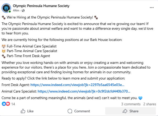 The Olympic Peninsula Humane Society is hiring animal care specialists and a front desk agent.