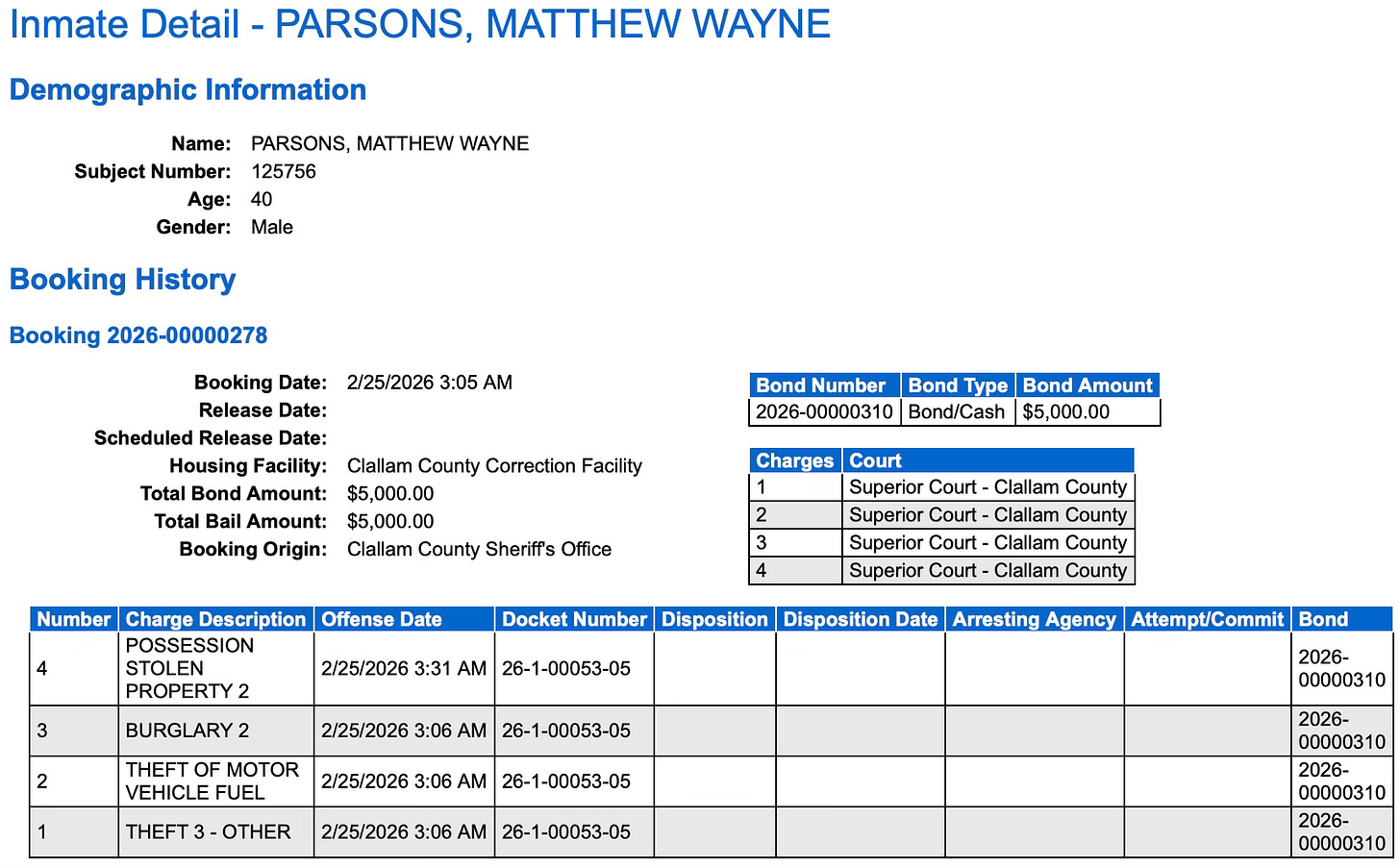Matthew Parsons, 40, was recently booked into Clallam County Jail for possession of stolen property, burglary, and theft of motor vehicle fuel.