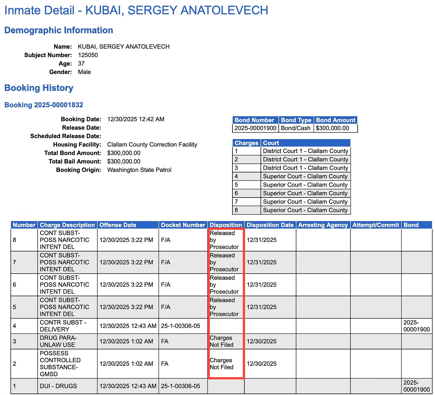 Sergey Kubai, a recently arrived felon from Montana, was featured on Seattle-area news after being arrested three times in Clallam County in December on drug- and weapons-related charges.