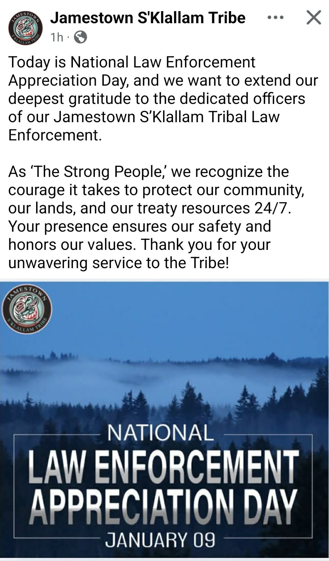 On National Law Enforcement Appreciation Day, the Jamestown S’Klallam Tribe posted a message expressing deep gratitude for law enforcement officers — specifically Jamestown S’Klallam Tribal Law Enforcement.