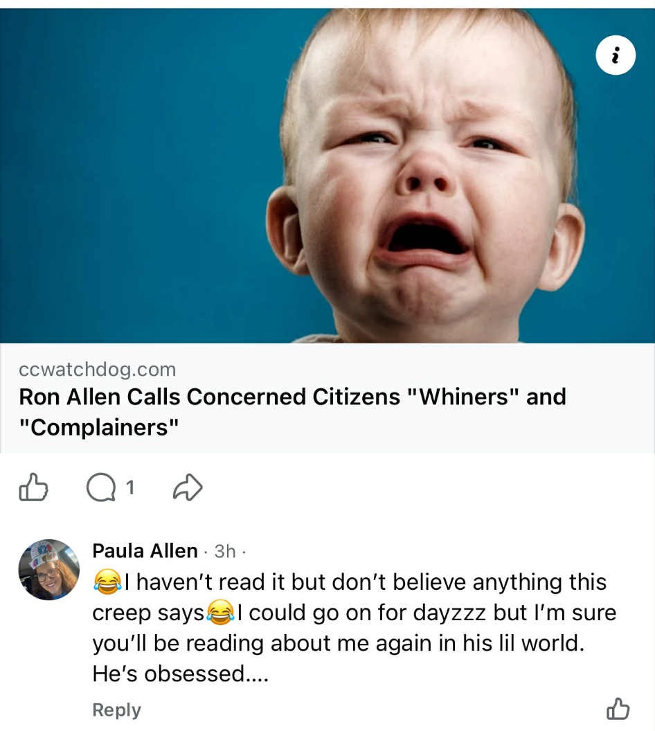 First, Ron Allen dismissed concerned citizens as “complainers and whiners.” Now, his niece Paula Allen has added “creep” to the vocabulary.