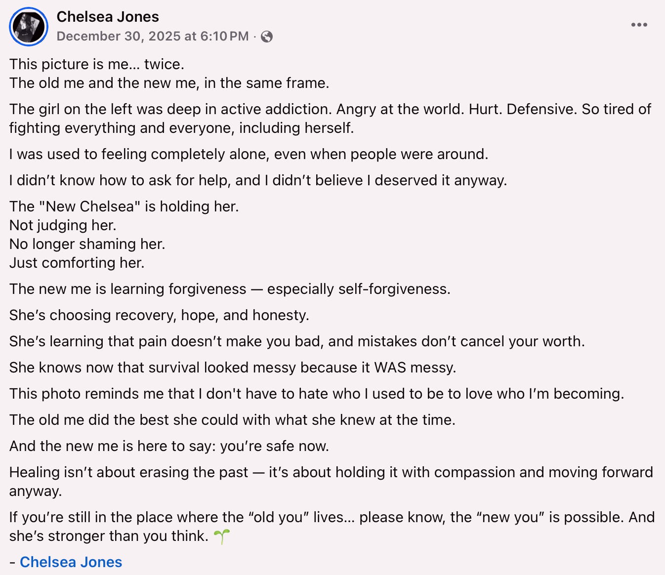 Recently, Jones shared a powerful image: the sober version of herself holding the addicted version in her arms.