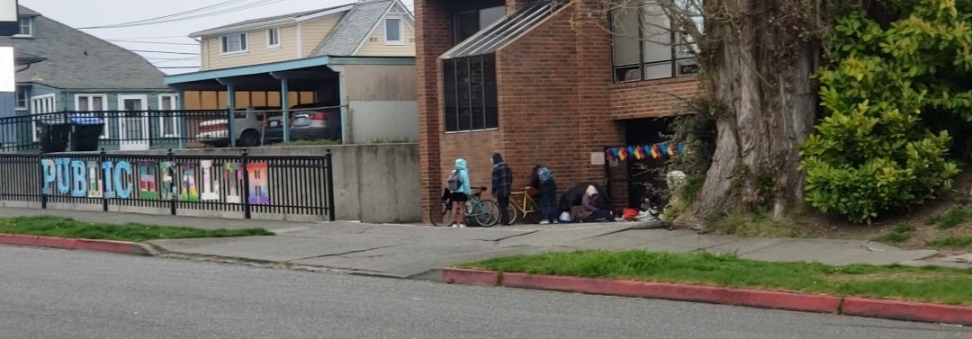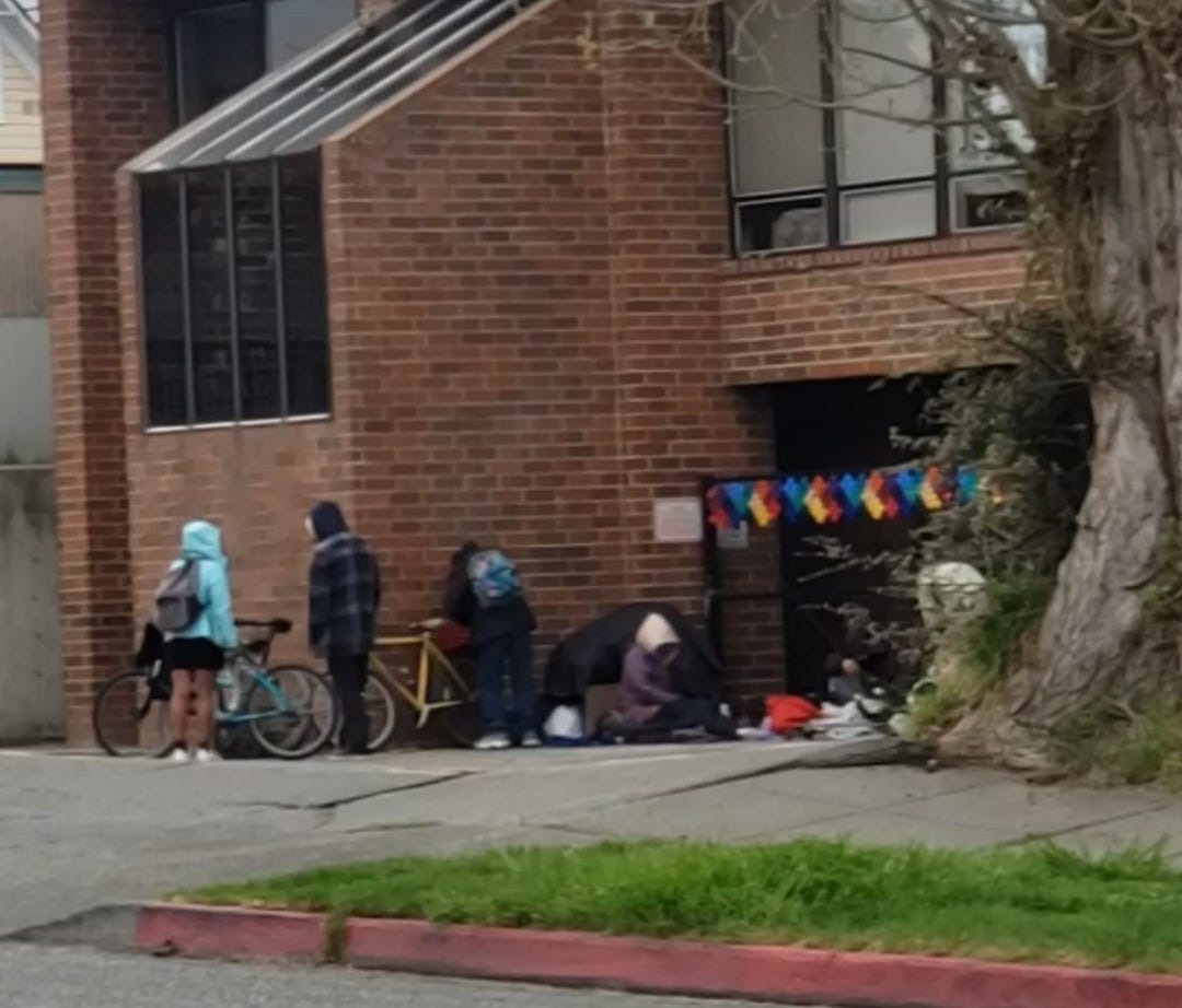 Just beyond the sign, the parking lot is lined with tents, with people stretched out on the pavement. In a nearby alcove—next to a Narcan dispenser—individuals appear to be actively using drugs.