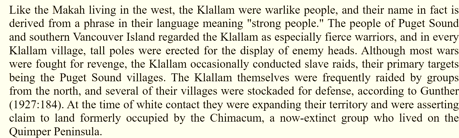 Additionally, historical accounts from the Olympic National Park describe the Klallam as fierce warriors who conducted slave raids and displayed enemy heads on tall poles, aspects not covered in the training. Critics argue that a comprehensive educational approach should include all facets of history.