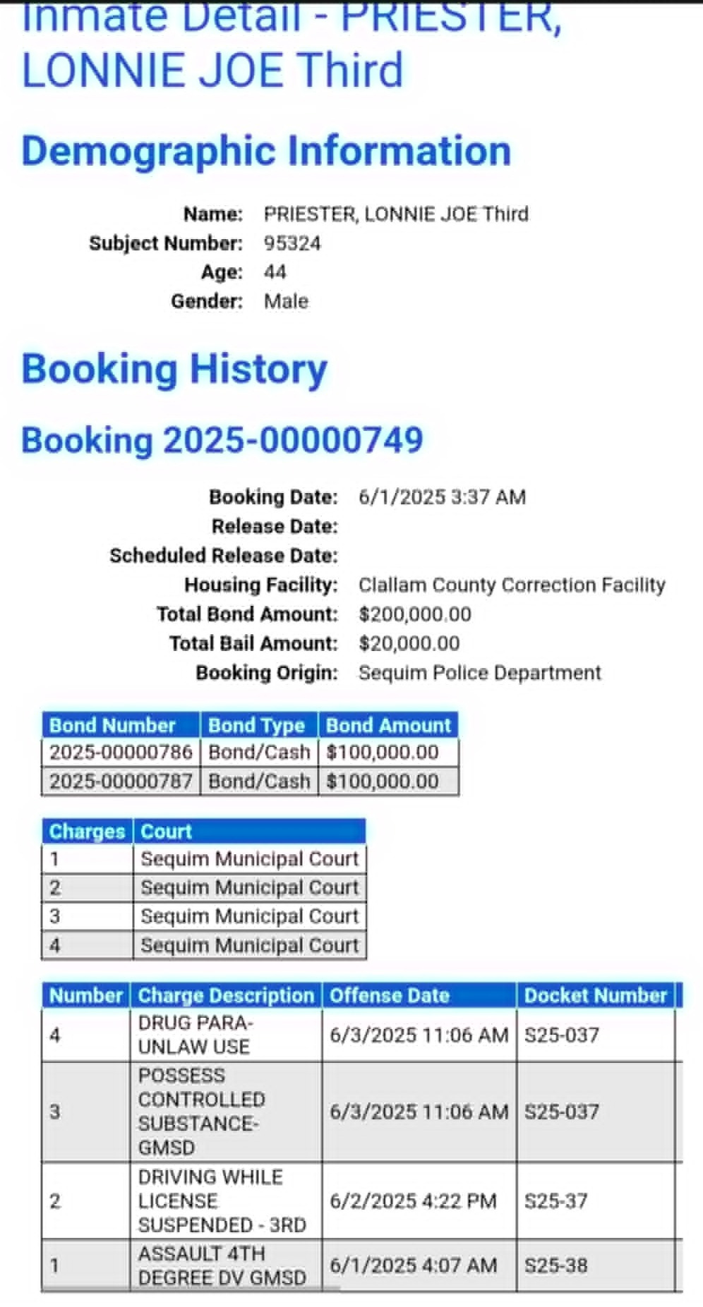 Level 3 sex offender Lonnie Priester (featured earlier this week) was booked into Clallam County Jail on June 1 without bail or bond. One day later, on June 2, he was charged with driving with a suspended license. The day after that, came two drug charges.