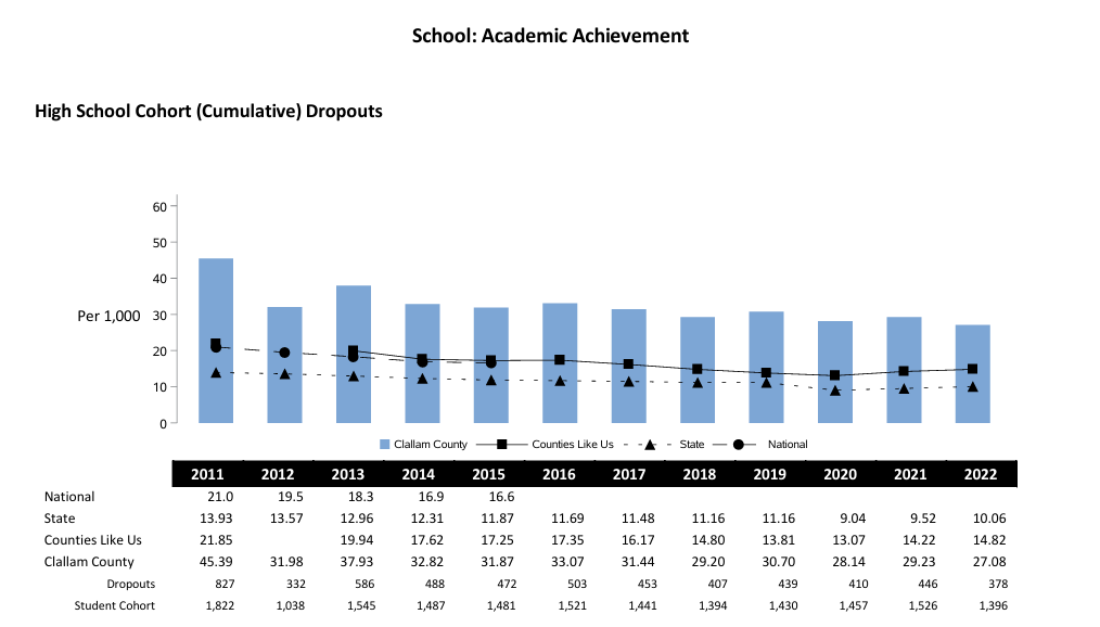 The Community Outcome & Risk Evaluation from January 2025 reveals that Clallam County's high school dropout rate in 2022 was nearly three times the state average.