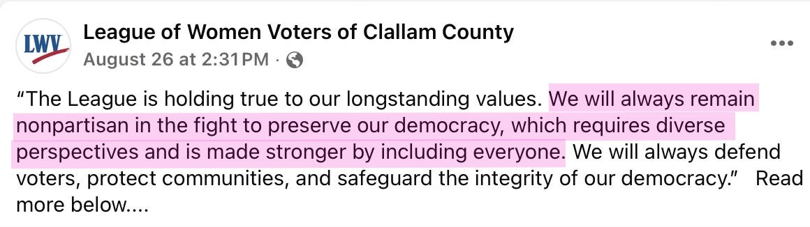 The League of Women Voters is officially listed by Clallam County Elections as a nonpartisan civic organization. However, in practice, its leadership has acted as a political advocacy group—passing signals to Chair Fisch during meetings, singling out speakers, and advancing viewpoints that align with a particular ideological bloc while framing dissent as illegitimate. That is activism, not neutral civic education, regardless of how it is branded.