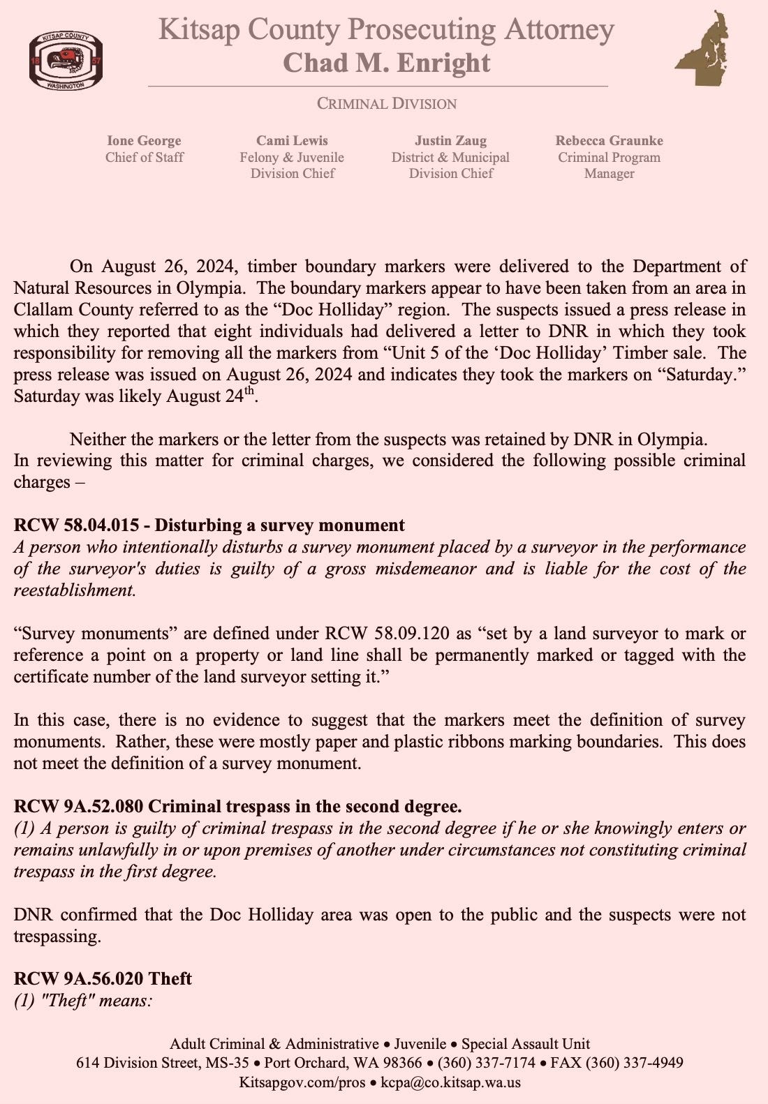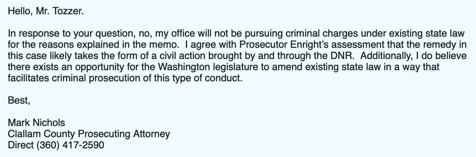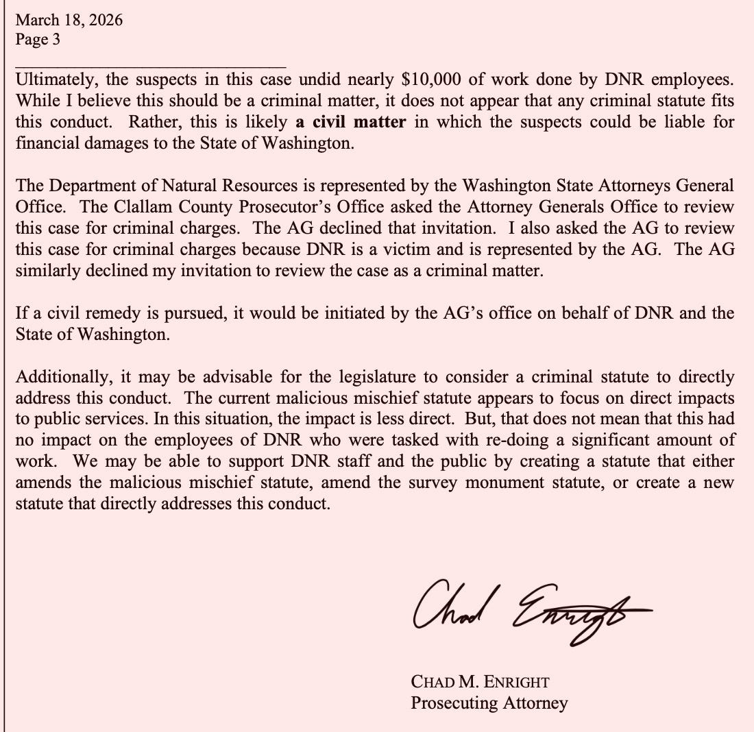 According to a March 18, 2026 memo from Kitsap County Prosecuting Attorney Chad Enright, who was brought in as a special deputy prosecutor, the conduct “should be a criminal matter,” but ultimately does not fit cleanly under existing Washington law.