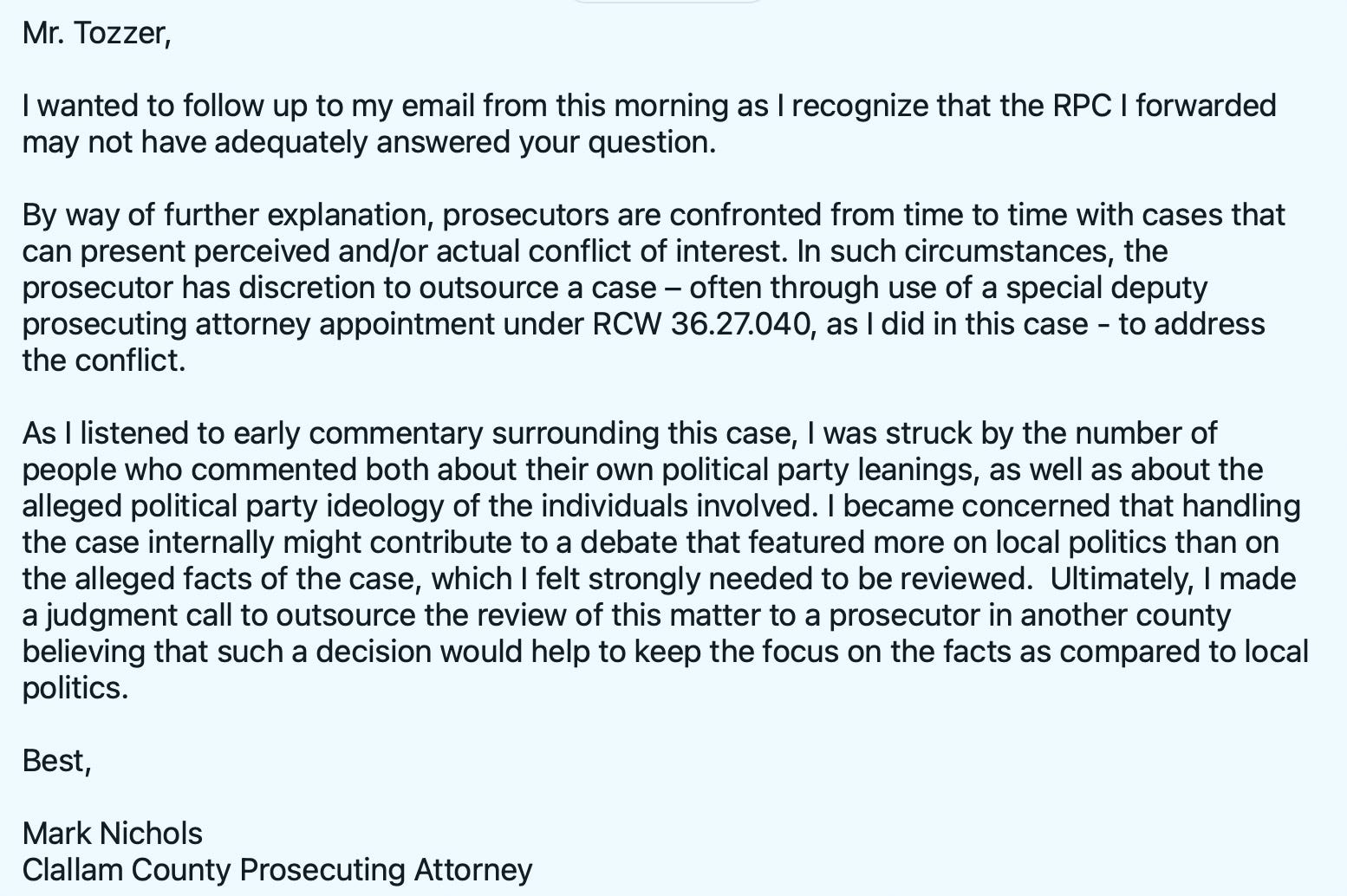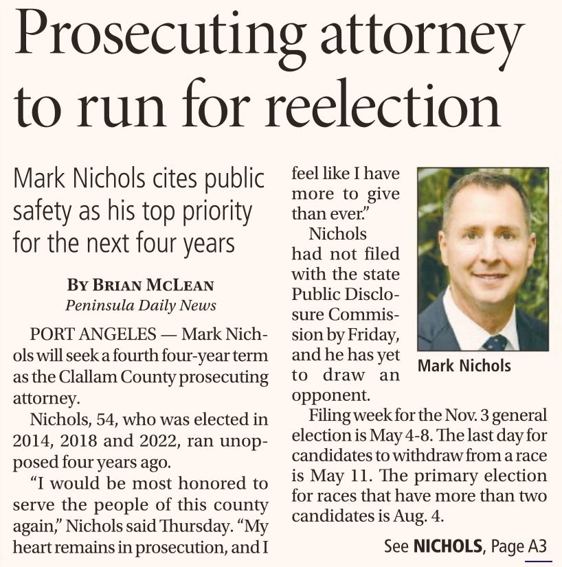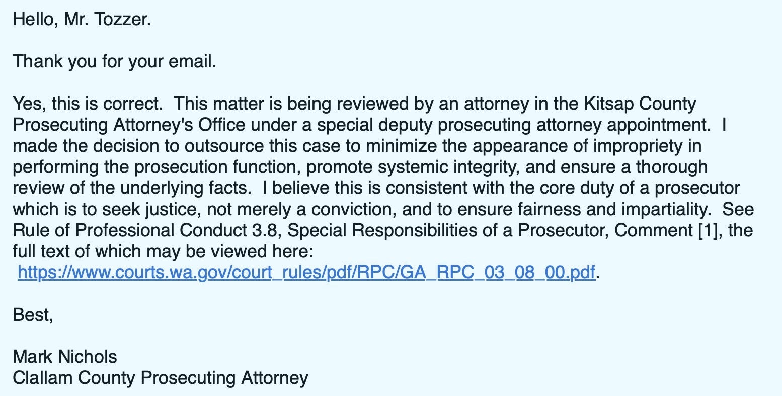 Clallam County Prosecutor Mark Nichols made the decision to outsource this case to Kitsap County, citing concerns about political perception and a desire to “promote systemic integrity.”