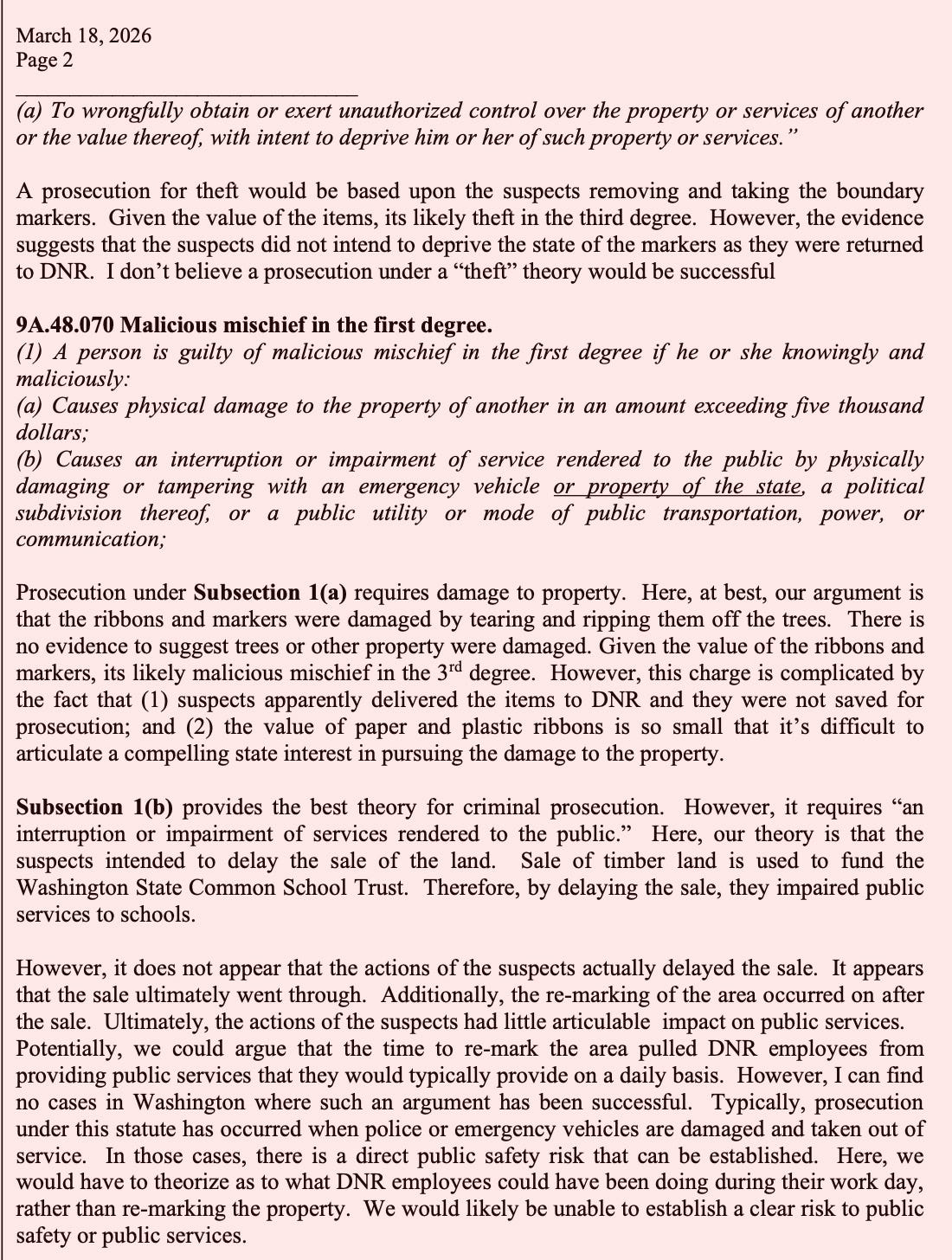 This was the strongest theory—arguing that disrupting a timber sale impacts school funding—but prosecutors concluded there was no clear evidence the sale was actually delayed.