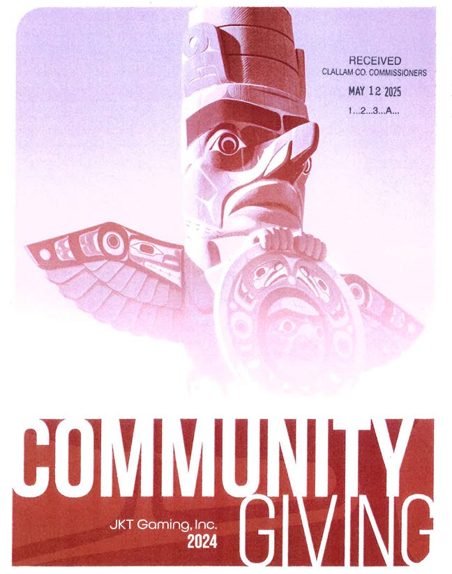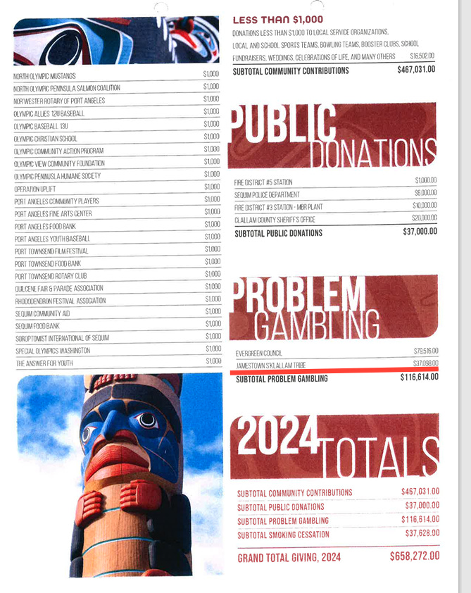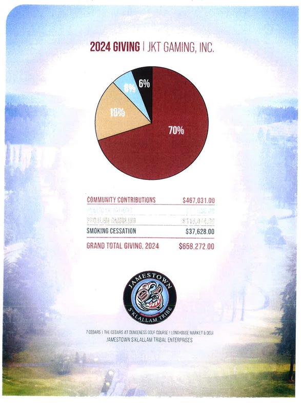 The Jamestown S’Klallam Tribe, operating through what is effectively a corporate holding structure, does very well for itself. In 2024, the Tribe reportedly generated $85.9 million in revenue. Their self-reported community giving, while appreciated by the recipients, represents less than 0.77% of that revenue.