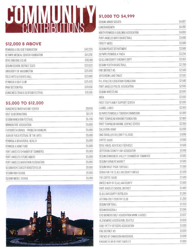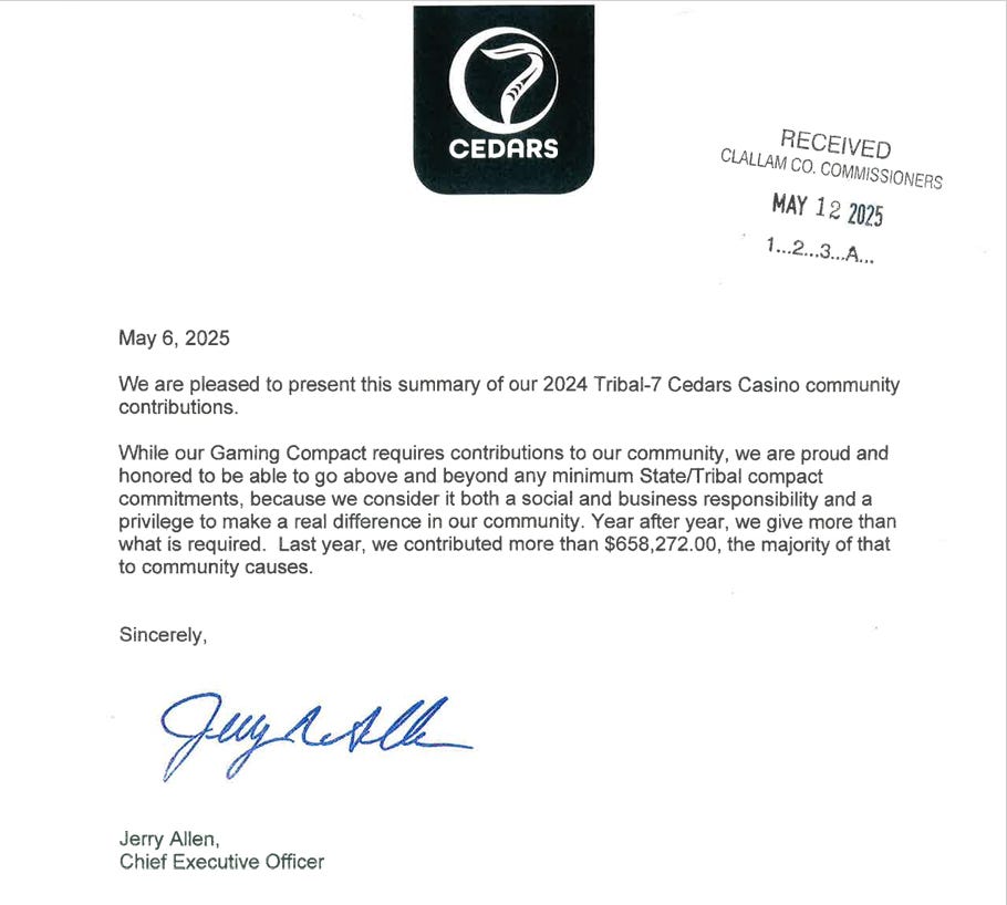 This month, the Jamestown S’Klallam Tribe sent a letter to the Clallam County Board of Commissioners summarizing its 2024 community contributions. “We are proud and honored to be able to go above and beyond any minimum State/Tribal compact commitments,” wrote Jerry Allen, CEO of 7 Cedars Casino. “Year after year, we give more than what is required. Last year, we contributed more than $658,272.00, the majority of that to community causes.”