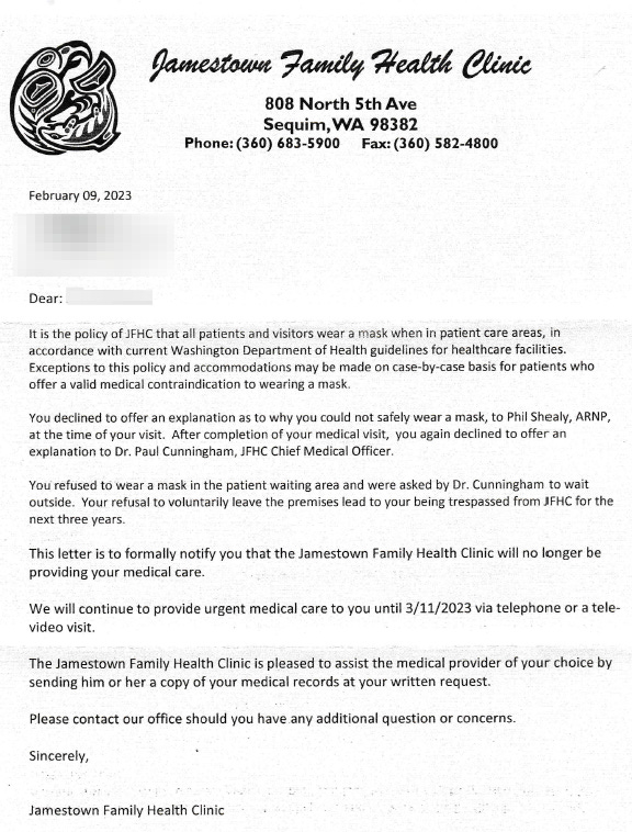 In February 2023, Laura visited Jamestown Clinic for the first time. She couldn’t wear a mask safely due to her injuries, a disability recognized by Washington state law—where mask exemptions were formally acknowledged until statewide mandates ended. Individuals didn’t need documentation.