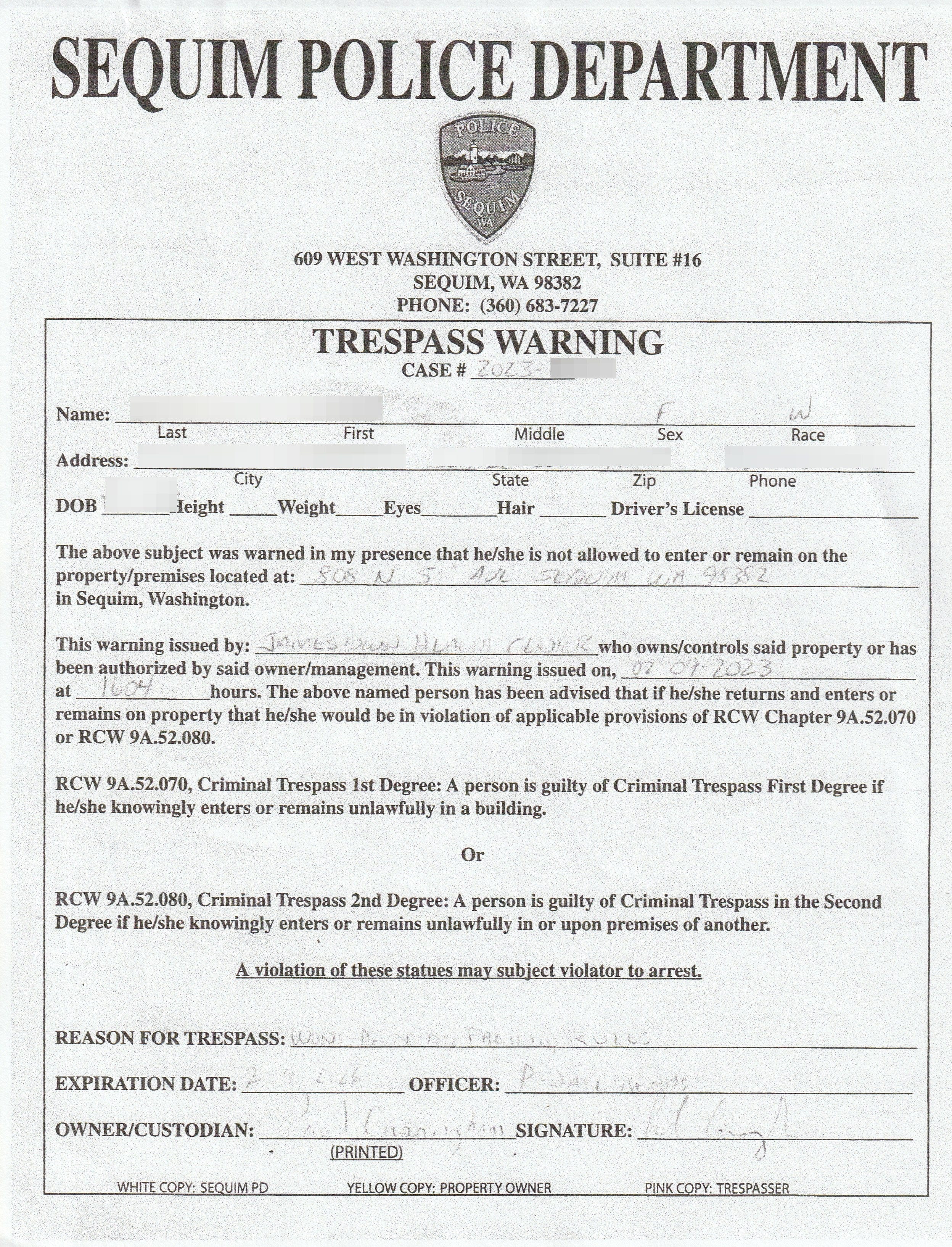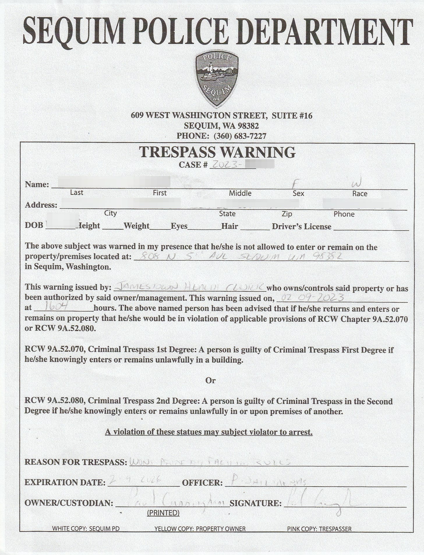 Laura asked ten times to see any policy or guidance the clinic claimed to follow—but none was produced. Instead, staff repeatedly pressured her to disclose medical details, threatened to cancel her appointment, and said she might never be allowed back. Eventually, Jamestown Clinic issued her a trespass warning, signed by its Chief Medical Officer, Paul Cunningham, stating she would not “abide by facility rules,”
