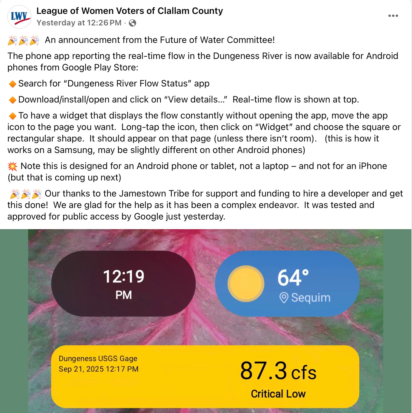 The League of Women Voters, backed by the Jamestown Tribe, launched a Dungeness River flow-tracking app for Android. Useful? Maybe. But the League’s history—pushing the unpopular Water Steward department and member Ann Soule’s call for the “retreat or removal” of 3 Crabs residents through her position on the Marine Resources Committee—suggests special interests at play. With Commissioner Mark Ozias’ top donor, the Jamestown Tribe, funding this, is it a public tool or a stepping stone for agenda-driven policies? Keep a skeptical eye on this “community” project.