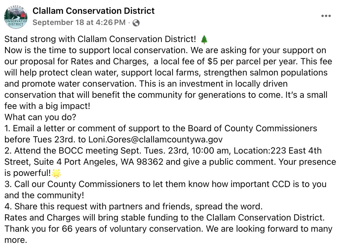 The Clallam Conservation District’s Facebook post begs for public backing of their $5 per parcel fee, claiming it’ll protect water, farms, and salmon. But this isn’t an NGO rallying support—it’s a government subdivision pushing you to lobby another government branch.