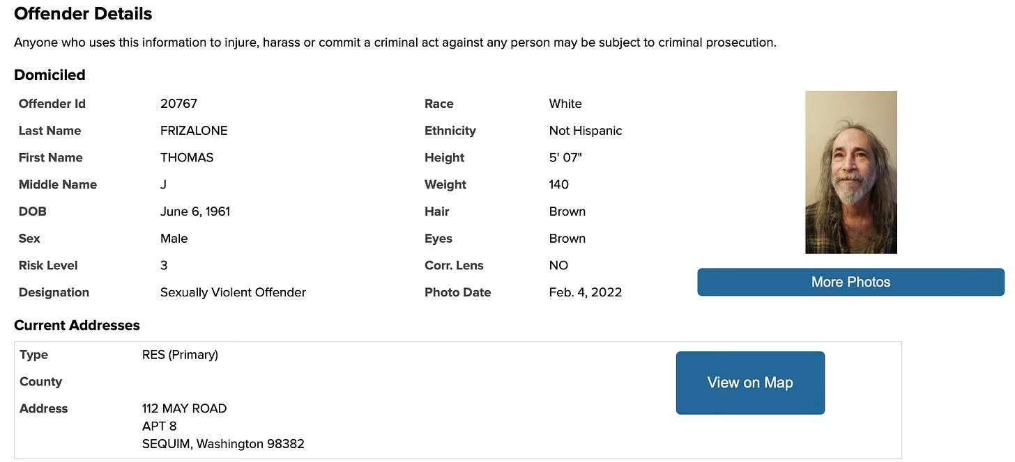 According to the New York State Sex Offender Registry, Frizalone’s listed address is in Sequim.