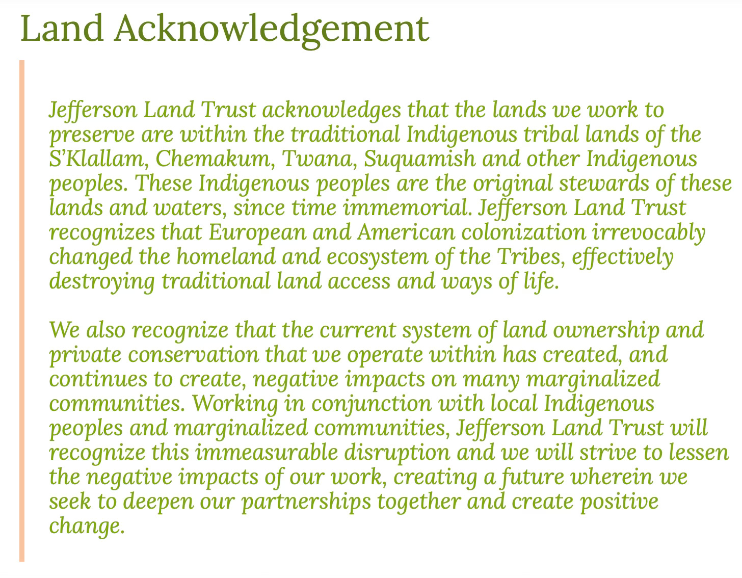 The organization acknowledges the land’s Indigenous history and the displacement caused by colonization.