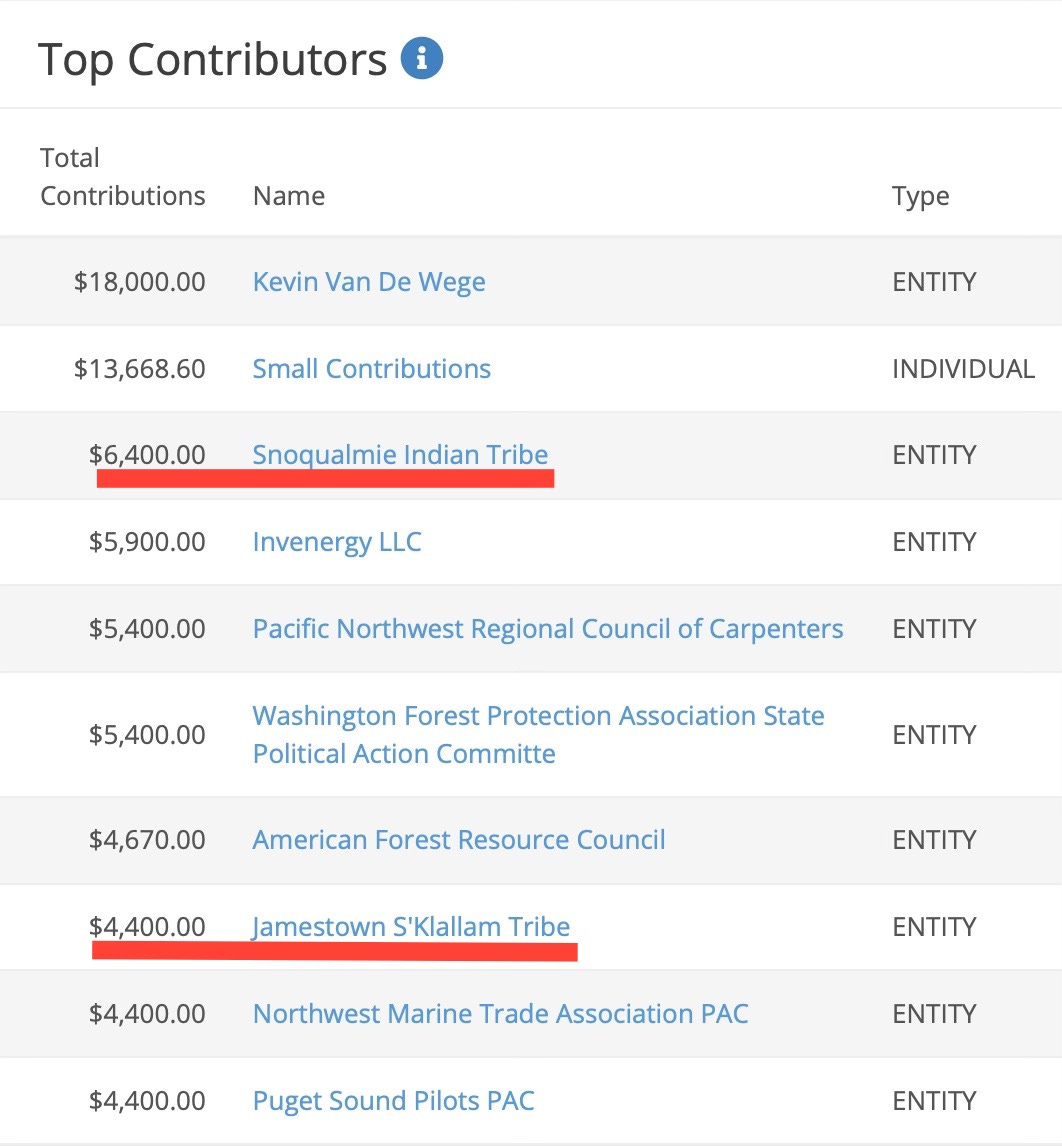 A recent levy raised that portion of their taxes by 35%, yet tribal land held in trust remains exempt. Meanwhile, the funds saved by these exemptions can be funneled into political campaigns, including Van de Wege’s own.
