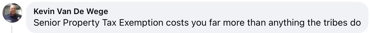 Former state senator and representative Kevin Van de Wege commented on a recent Facebook discussion about rising property taxes, noting that senior citizen exemptions cost far more than tribal trust land exemptions—without providing any numbers.