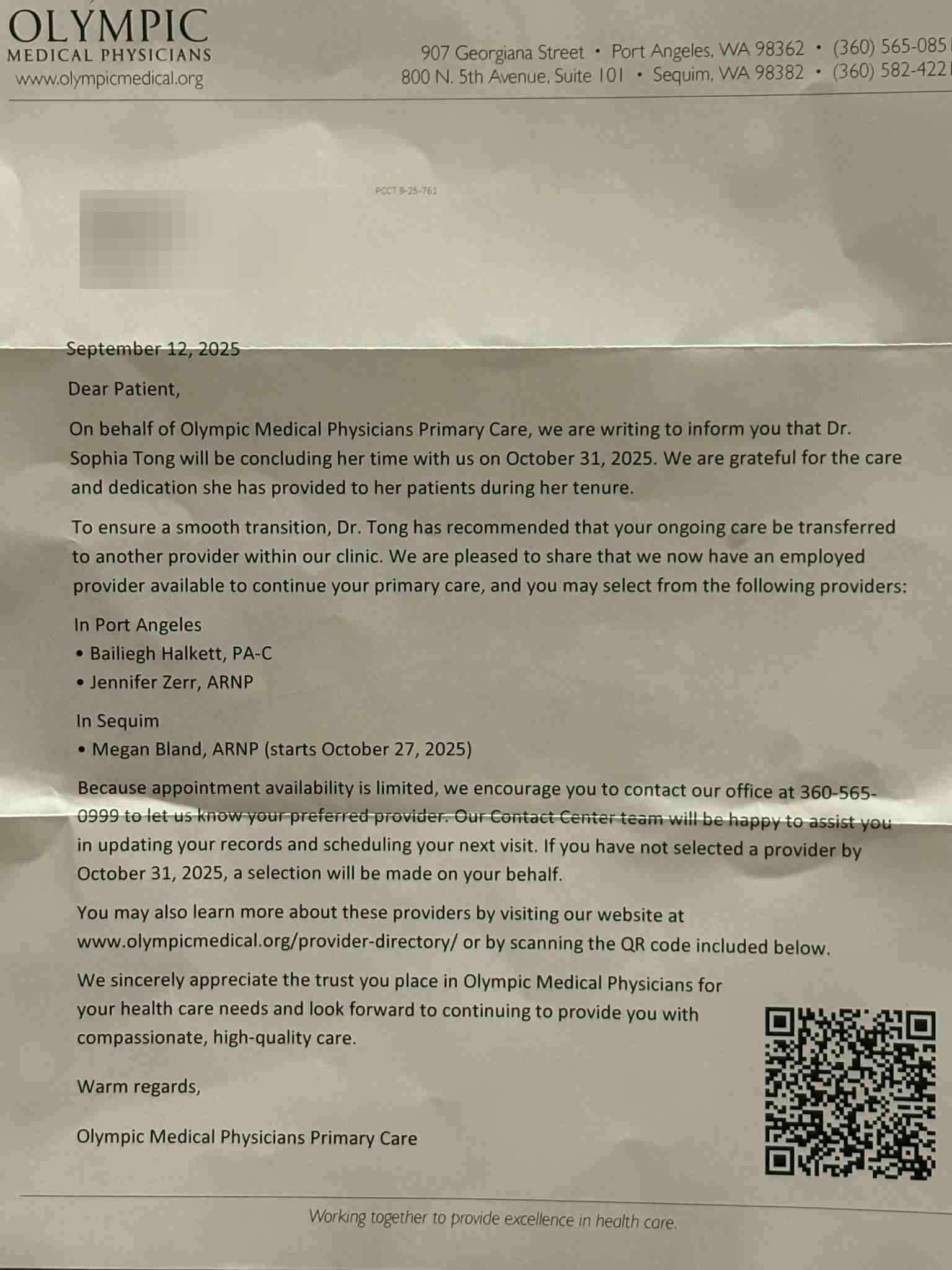 A CC Watchdog subscriber recently shared a troubling experience: after years with the same doctor, they were informed by Olympic Medical Center that they must choose from three non-doctors or have one assigned to them. The patient has several serious conditions, including lung nodules that could develop into cancer, and has been unable to secure a doctor for five years.