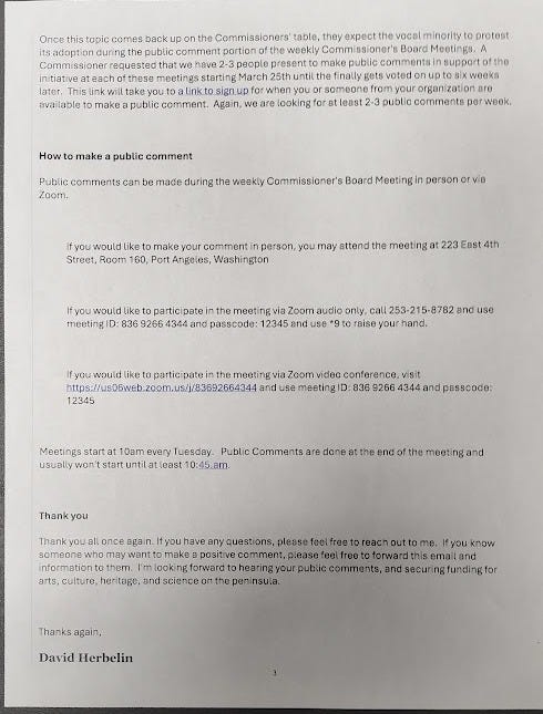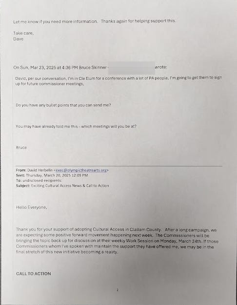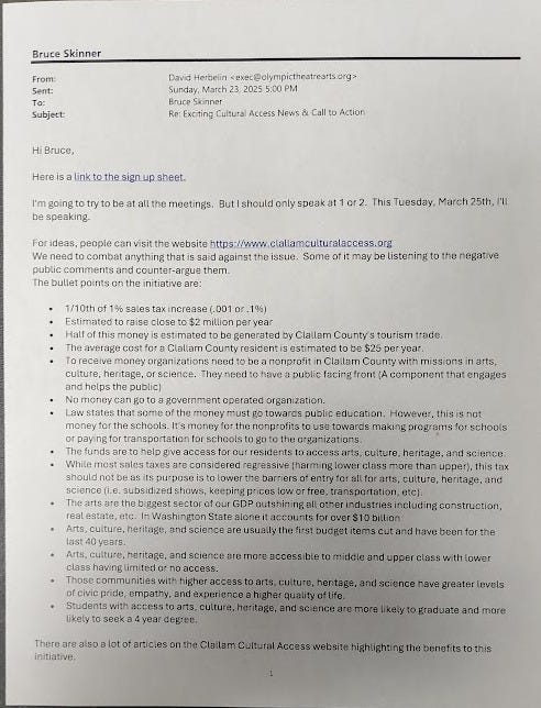Behind closed doors, Clallam County commissioners and well-connected arts executives are quietly orchestrating a plan to impose a new "Culture Access Tax" without a public vote. Leaked emails reveal a coordinated campaign by special interests to pack commissioner meetings with handpicked supporters while marginalizing dissenters and dodging meaningful public engagement.