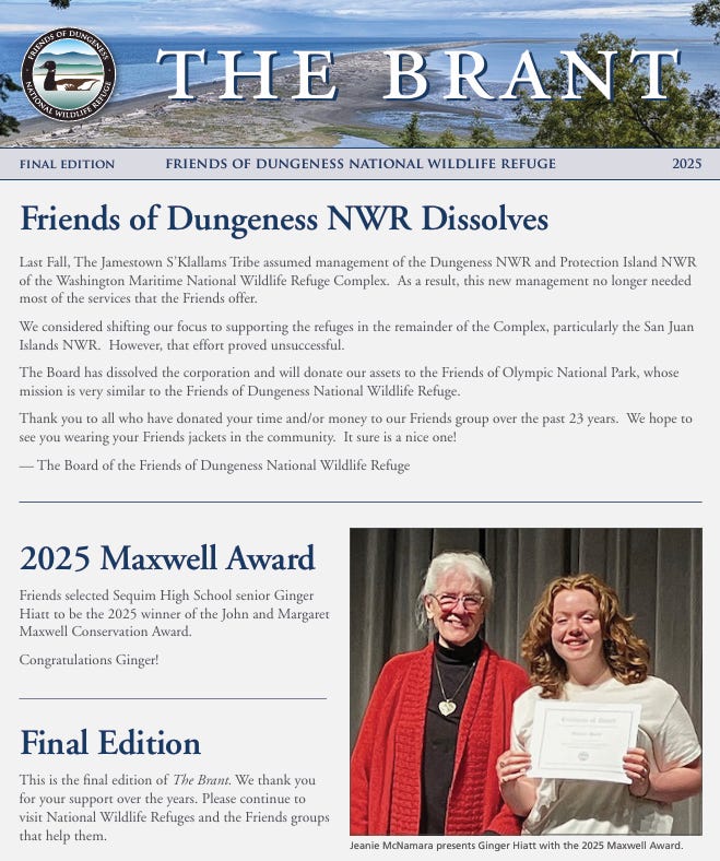 The Friends of Dungeness National Wildlife Refuge published their final edition of "The Brant" newsletter this month. Why? Because the Jamestown S’Klallam Tribe, now effectively managing the refuge, determined their volunteer group is no longer needed.