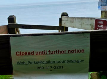Panorama Vista Park, a county park at the end of East Sequim Bay Road, remains closed—at least partially. According to the county's parks director, the park itself is open, but beach access is closed until safety and environmental issues can be resolved.